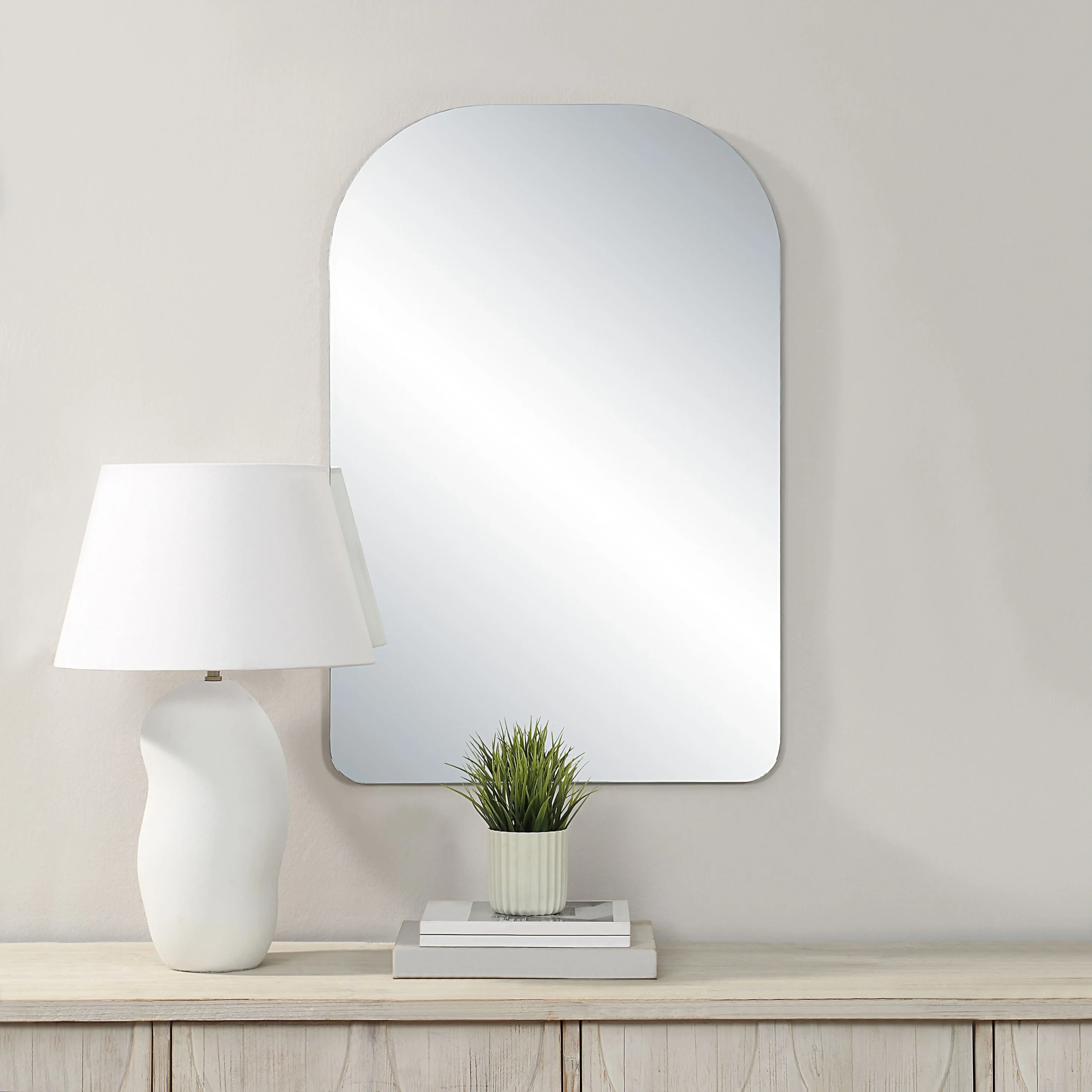 Chania proves that a mirror can feel striking without relying on a traditional frame. Its clean frameless construction and arch-inspired silhouette create a look that is airy, modern, and highly adaptable to different interiors. Because the design can be displayed arch-side up or down, it offers a more flexible decorative approach while still maintaining a crisp and polished presence on the wall. The all-glass build helps keep the visual weight light, making it especially effective in bedrooms, hallways, entryways, and smaller rooms where openness matters. Its reflective surface brightens the interior and enhances depth, while the uncluttered outline lets it work beautifully in minimalist, contemporary, and transitional settings. Sleek and versatile, Chania delivers both function and style with effortless simplicity.