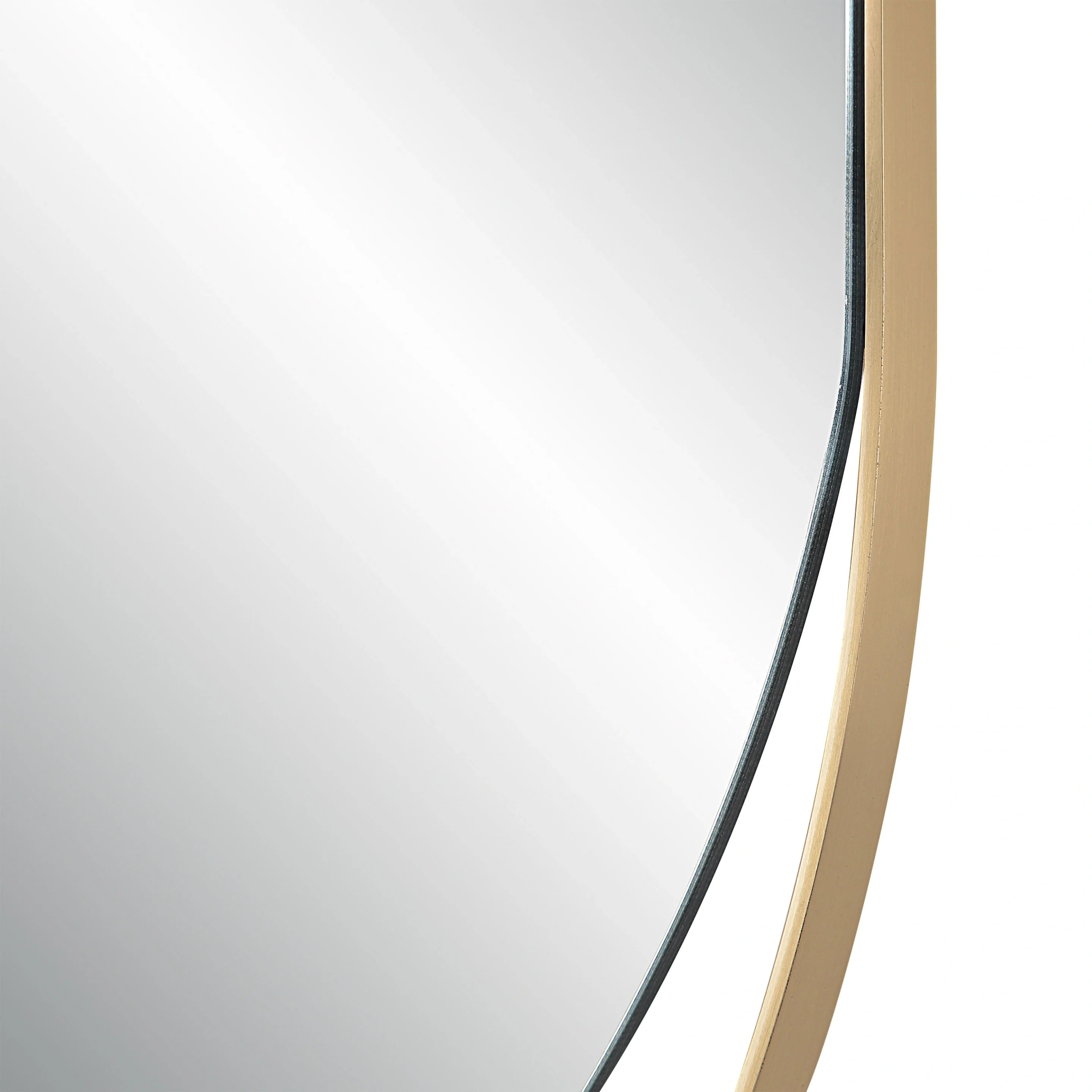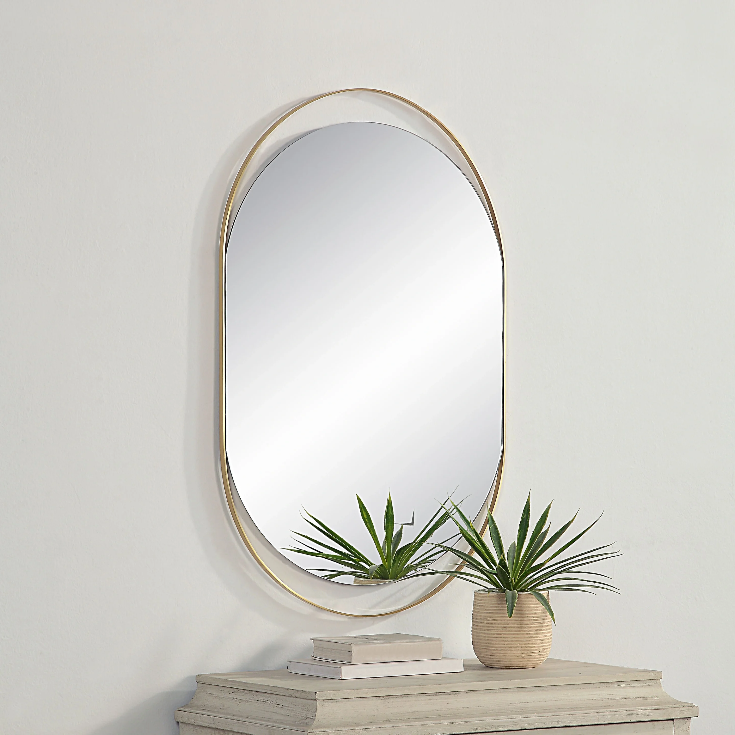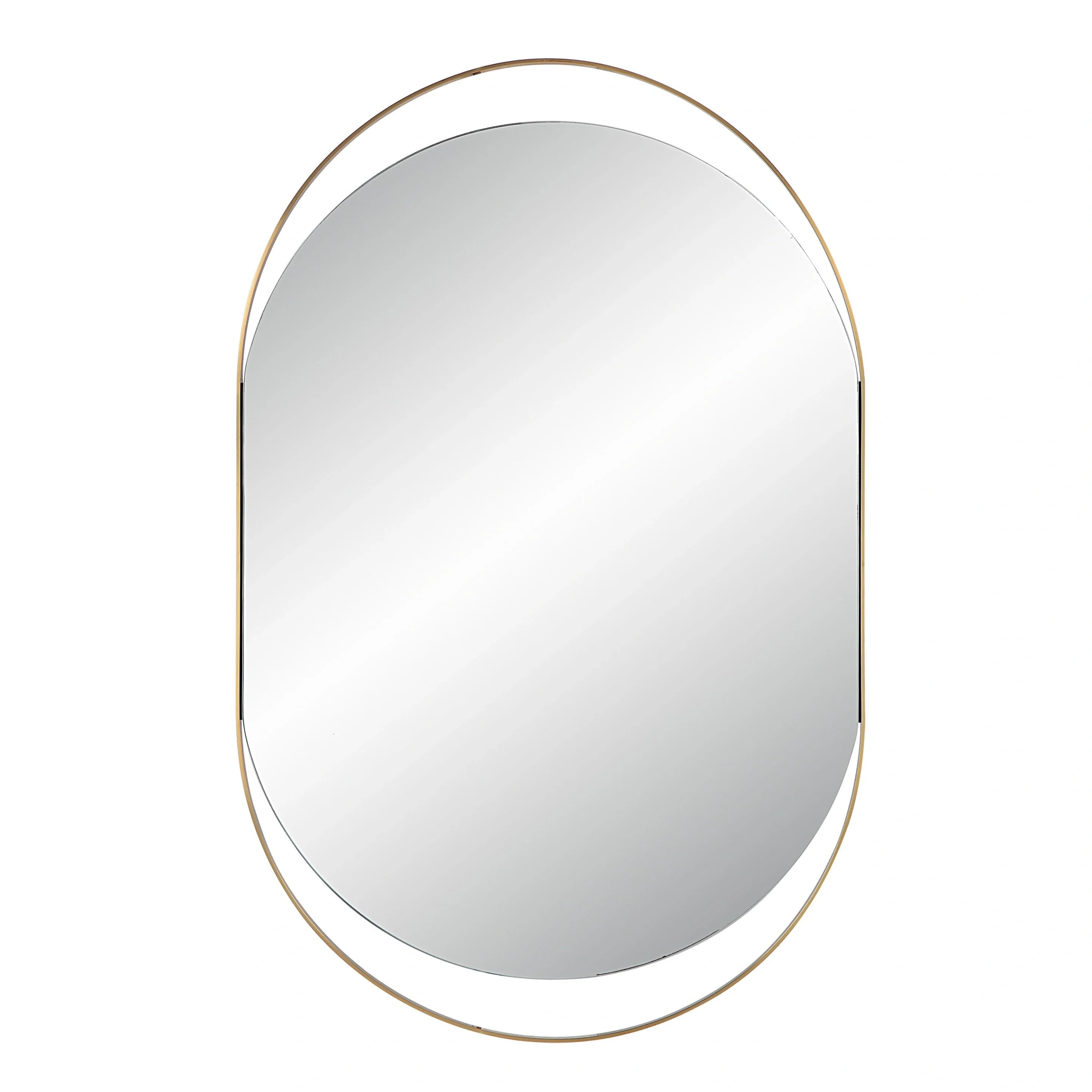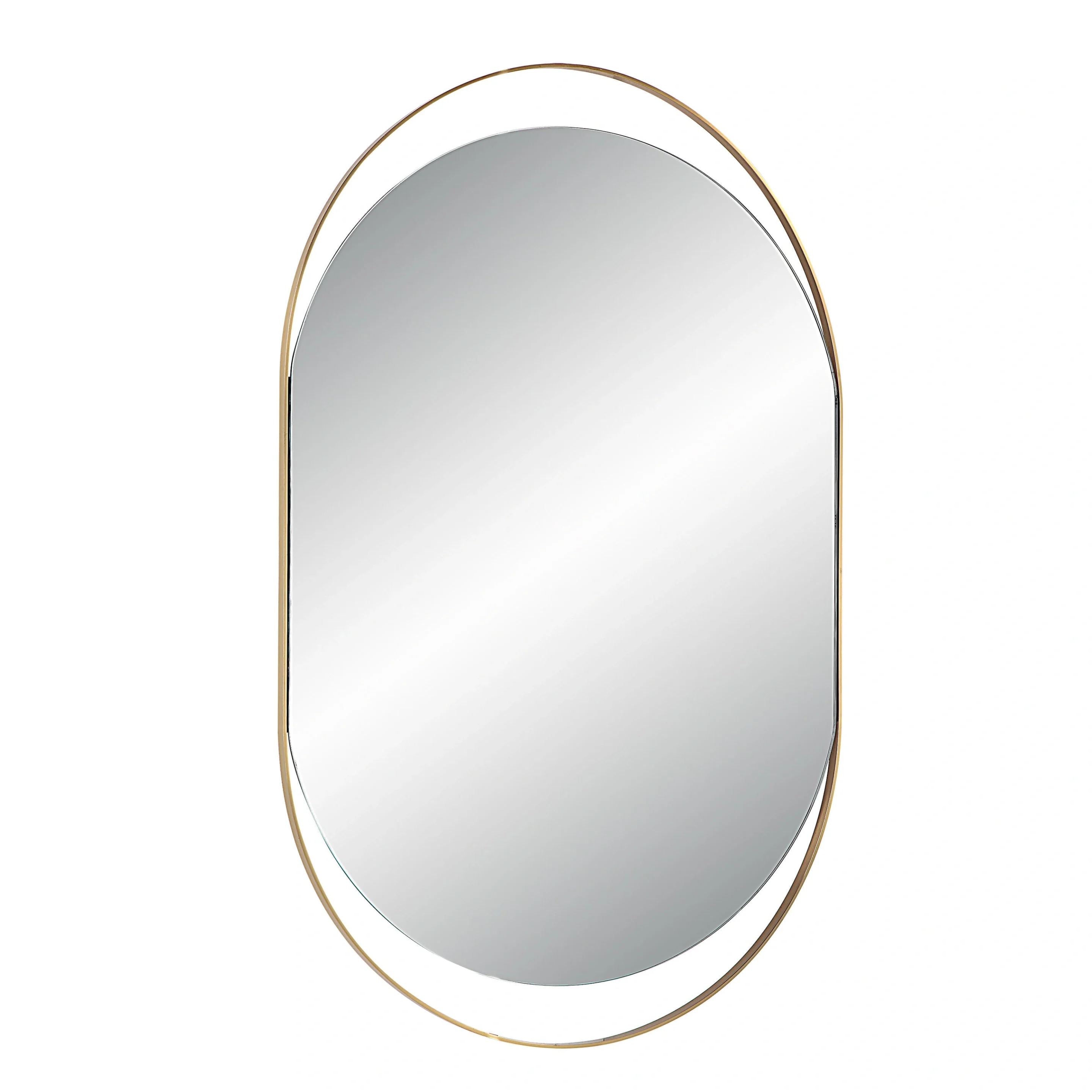 - Summary: Tall pill-oval wall mirror with a satin brass iron frame and flexible two-way hanging.