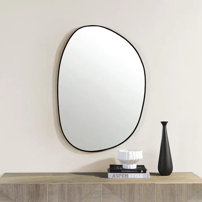 Bozeman is a bold wall mirror with an oval-inspired, slightly irregular frame that feels classic and modern at the same time. Use it above a console or sideboard to give the wall structure, then let the reflection lift the room by bouncing daylight and lamplight. The matte-black iron frame adds contrast without looking heavy, and the 4-way hanging option makes styling easy in tight layouts. Great for entryways, living rooms, bedrooms, hallways, and bathrooms when you want instant polish with minimal effort.