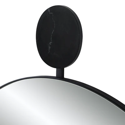 Finish Summary: Iron frame in a powder-coated matte black finish with clear mirror glass, MDF backing, and a marble accent detail