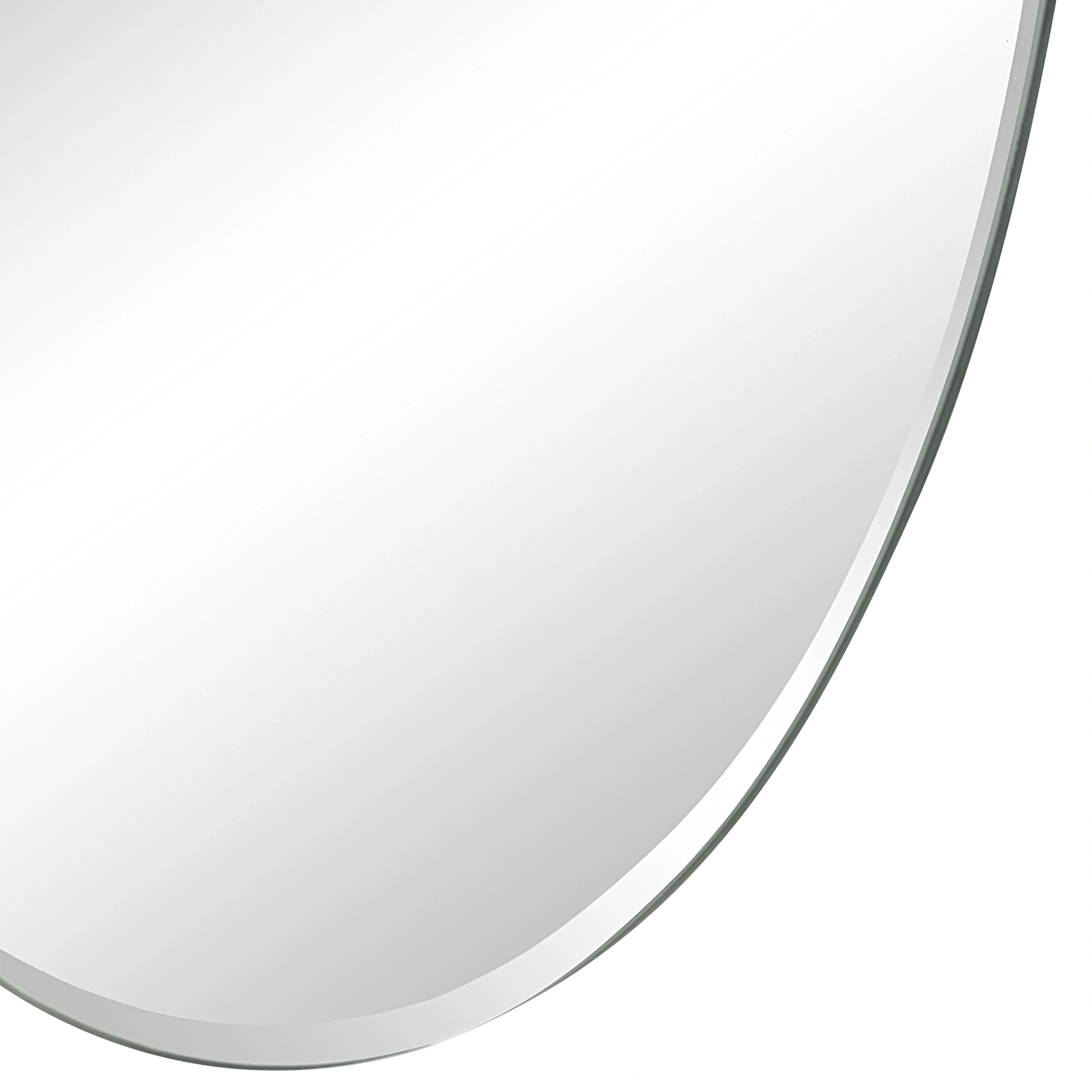 Summary: Frameless all-glass wall mirror with a beveled edge, irregular silhouette, and flexible four-way hanging.