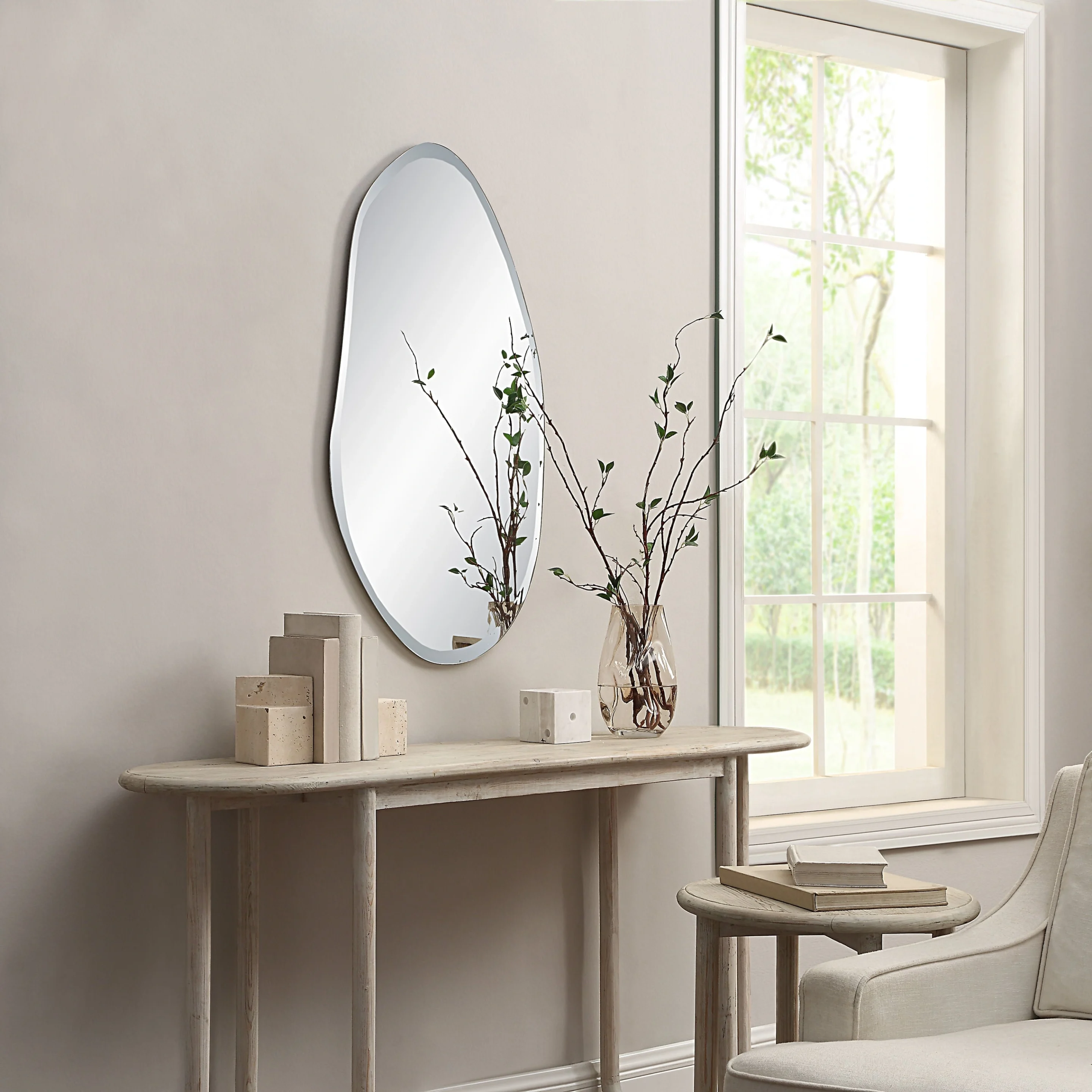 Anogia offers a simple yet elevated way to finish a room, combining a frameless irregular form with beveled, crystal-clear mirror glass for a look that feels crisp and contemporary. Free from visual heaviness, its all-glass construction keeps the profile light and versatile, making it easy to style in hallways, bedrooms, bathrooms, dressing spaces, and entryways. The reflective surface helps amplify natural and artificial light, creating a brighter and more open atmosphere, while the beveled detailing introduces extra dimension and a subtle tailored edge. With flexible hanging options and an understated modern presence, Anogia delivers practical function alongside a clean decorative statement that suits a wide range of interiors.