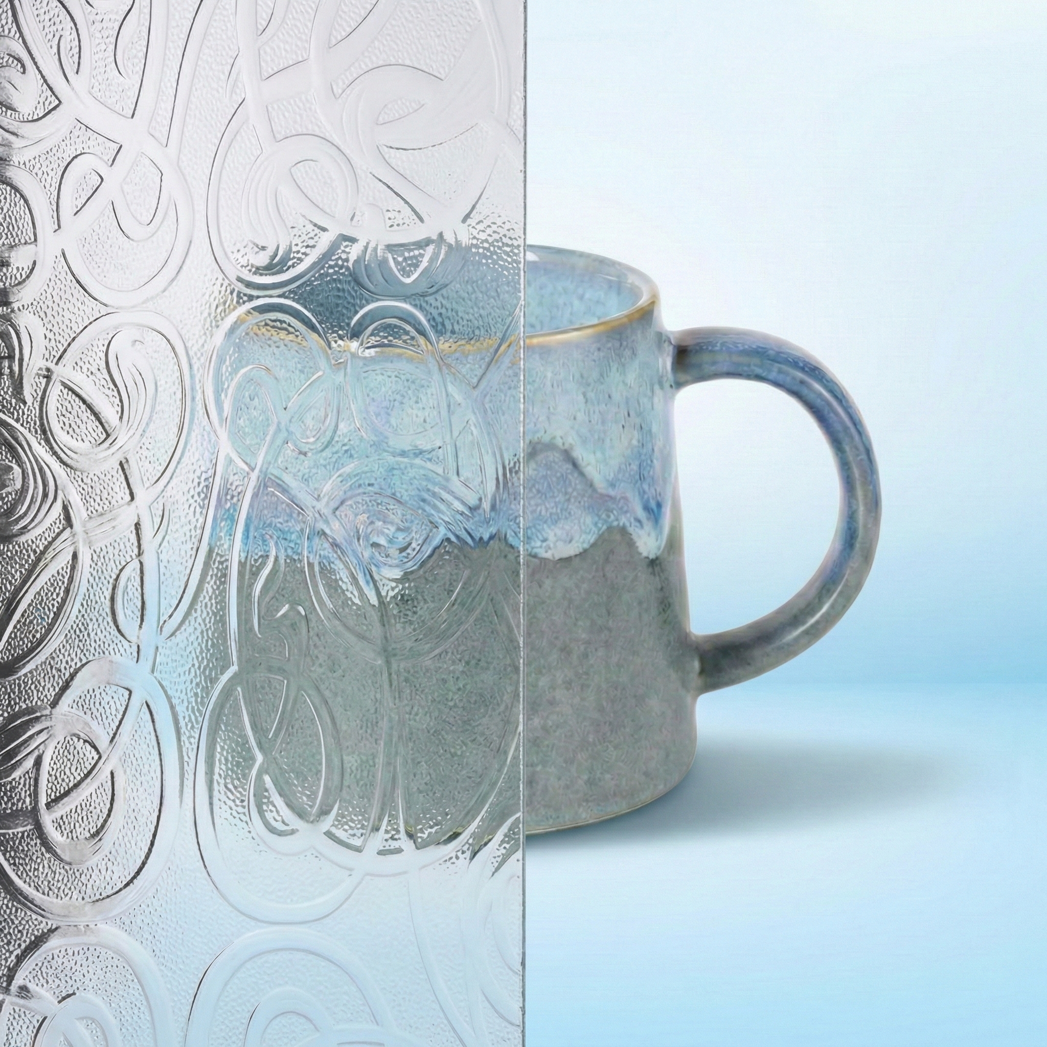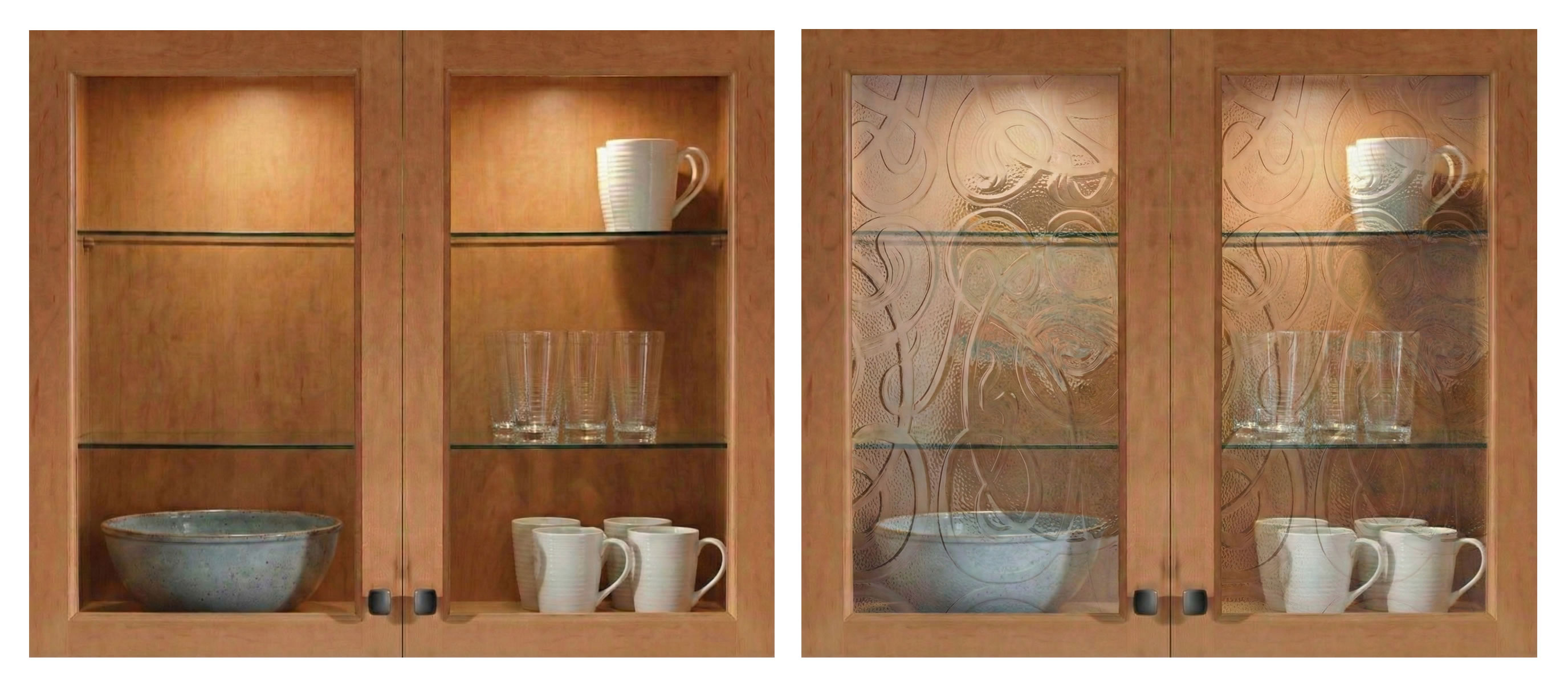 Patterned glass transforms ordinary surfaces into design features. Compare clear glass to Everglade and see how the dense swirling texture almost entirely conceals what’s behind it while maintaining full brightness. Dishes, glassware, and everyday items become soft, abstract impressions—making Everglade an ideal choice for spaces where you want the beauty of glass without any concern about what’s visible on the other side.