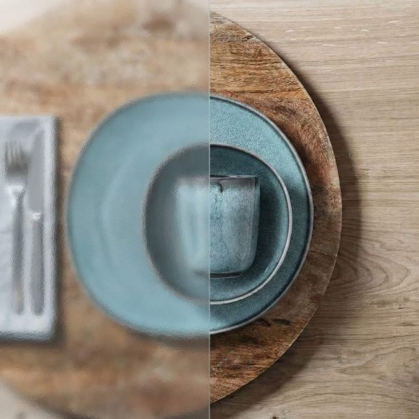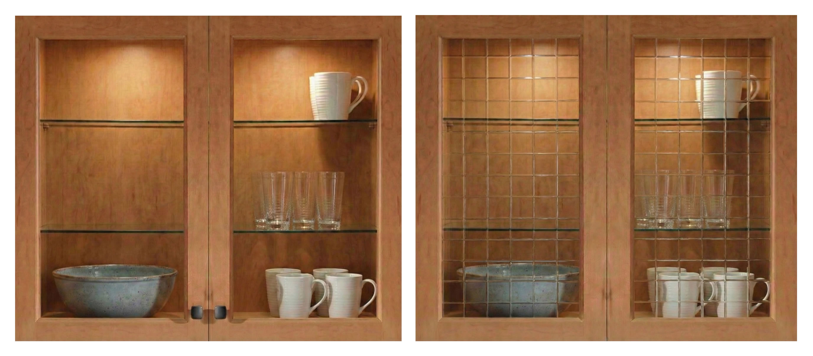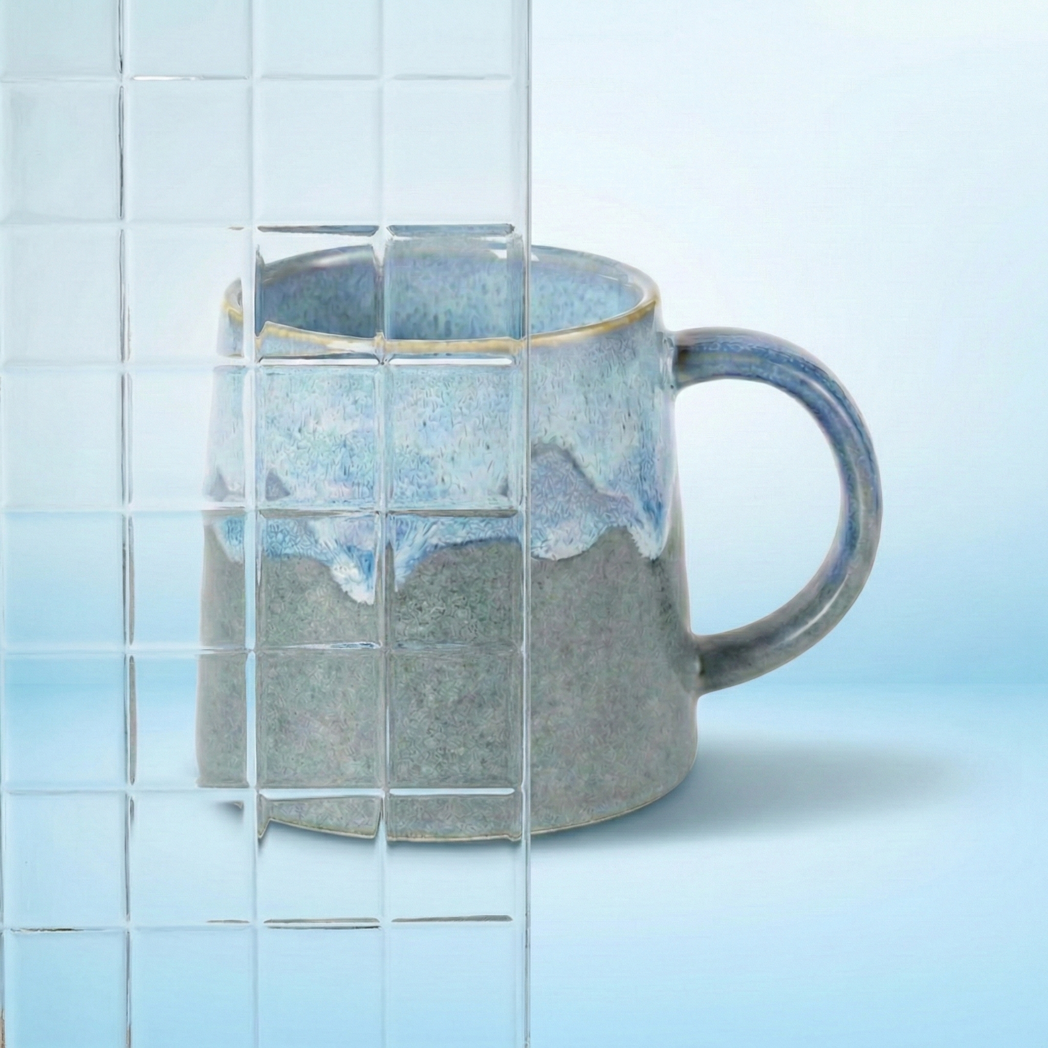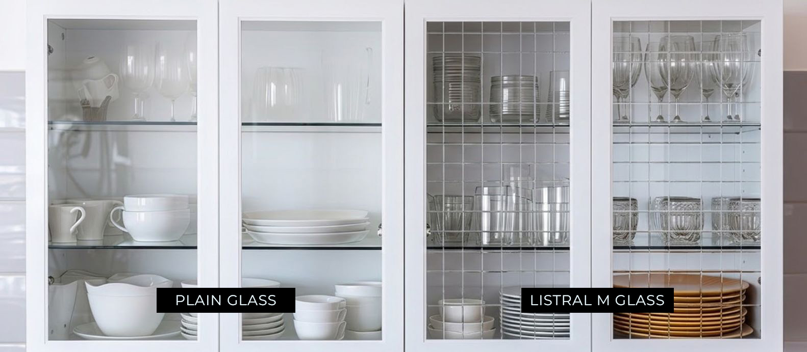 Patterned glass transforms ordinary surfaces into design features. Compare clear glass to Listral M and see how the cross-reeded grid divides the view of objects behind it into small, uniform squares. Dishes, glassware, and everyday items remain visible in colour and form, but the geometric overlay adds a striking architectural quality like looking through a glass tile wall. It’s a pattern that makes a visual statement while keeping spaces bright and open.