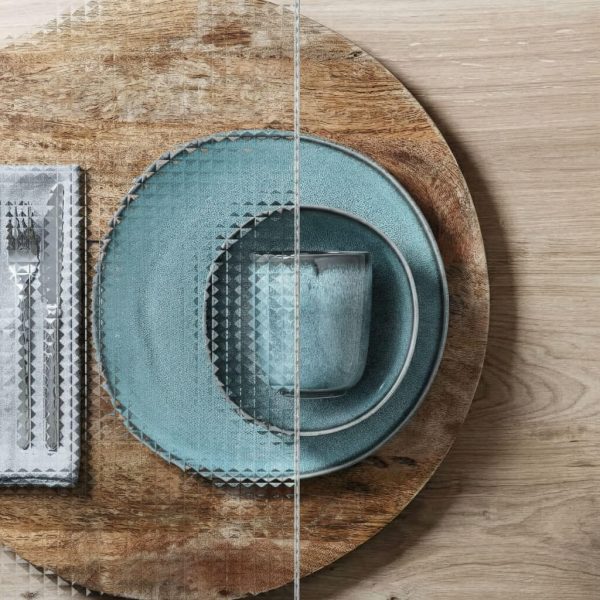 Listral D is a sophisticated, geometry-inspired patterned glass featuring a repeating diamond and triangular facet pattern. It brings a sense of structured elegance and decorative refinement to any interior.