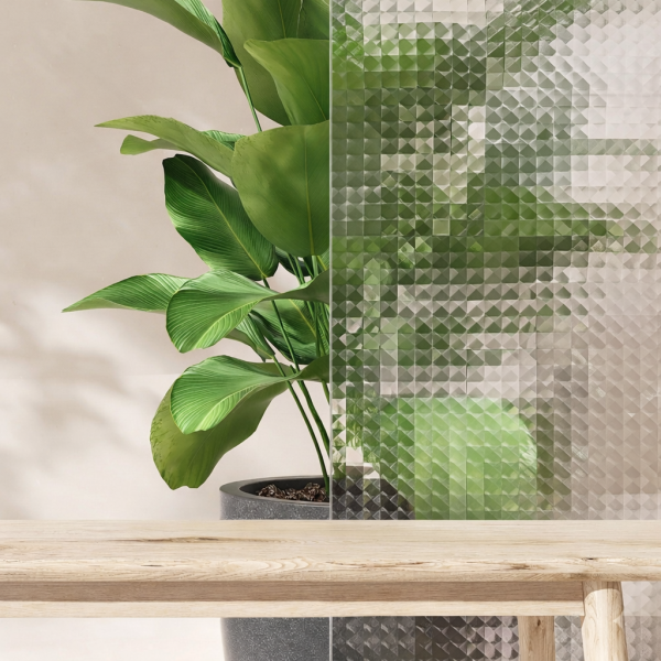 The repeating diamond facet pattern breaks views into precise, fragmented segments, diffusing shapes and colours into a structured, jewel-like blur effective where a decorative level of visual separation is needed.