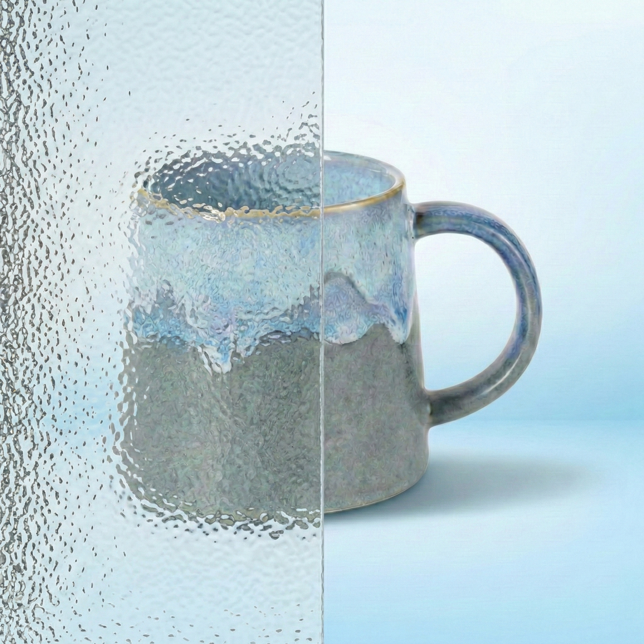 This subtle, uniform pattern offers moderate privacy—enough to obscure details behind the glass while preserving colour and general shape.